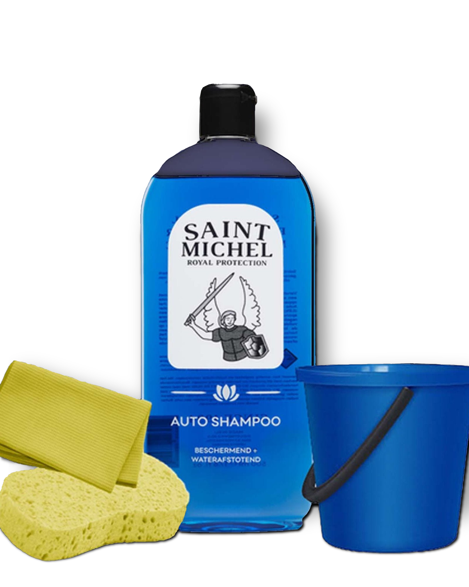 Naast een fles autoshampoo van 500ml, zit er in het was-pakket ook een spons, een emmer en een zeem. Wassen maar!